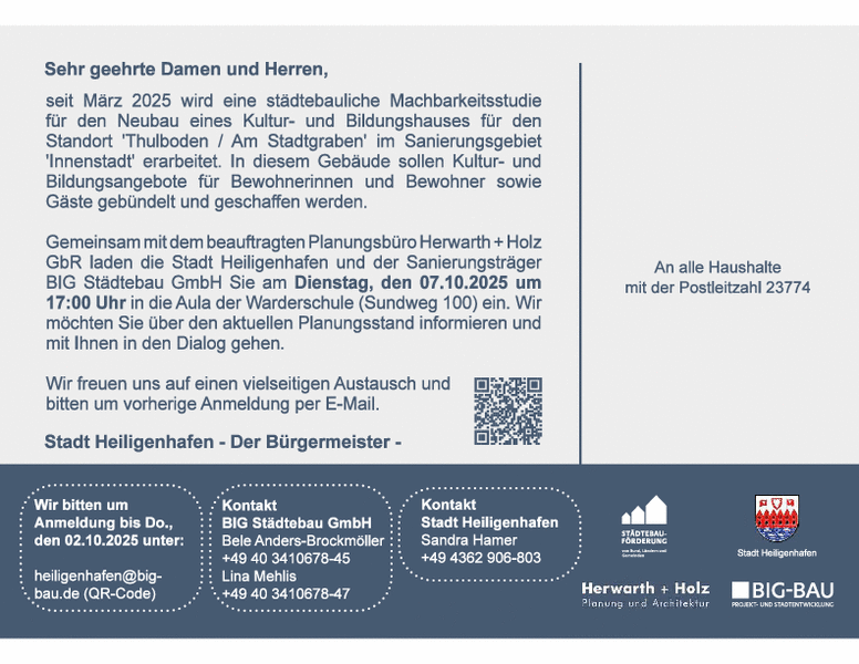 Aus organisatorischen Gründen wird um Anmeldung zur Teilnahme bis Donnerstag, den 02.10.2025 unter heiligenhafen@big-bau.de gebeten.